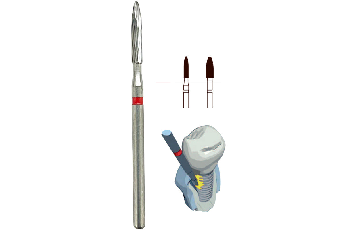 A periimplantitis treatment solution may be to remove the exposed threaded structures on the implant, leaving the surface soft and smooth to reduce and avoid the formation of renewed plaque. Recommended speed: 40,000 rpm in the 1:5 contraangle with plenty of water cooling. Can also be used for gingiva plastic, see veterinary surgery here