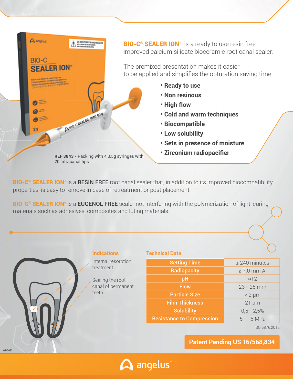 Excellent fluidity, can be used with all points and obturation techniques, both cold and hot. Flows excellently in bi-channels. Biocompatible, no tissue damage.