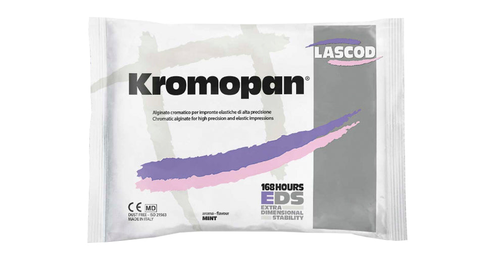 Alginate with mint flavor, Chromatic and thixotropic. Class A1, With 168 hours of dimensional stability, time in the mouth only: 30 sec, completely debonded: 2 min. Chromatic phase indicator: Purple = mixing, Pink = spoon, White = imprint.