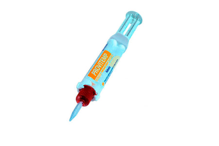 Self-mixing syringe, resin based improved compatibility, dentin colored for aesthetic result, without eugenol, water repellent, contains fluoride, radiopaque.