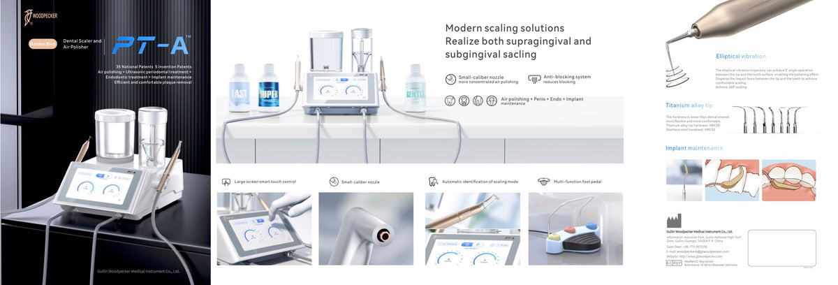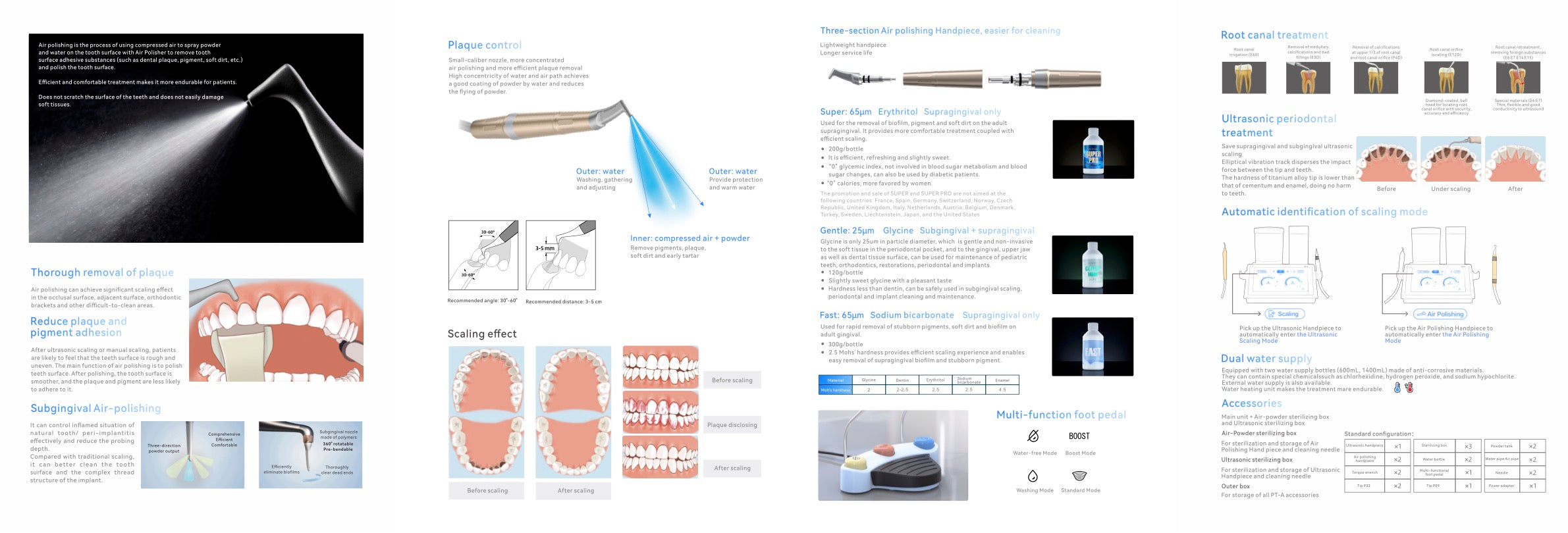 Air polishing both SUB and SUP with soft ergonomic tips that are guided down into the pouch without hindrance. Removes pigment, plaque and early stages of tartar.