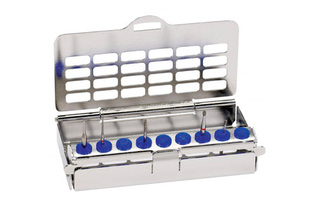When the lid is closed, the holder functions as a mini-cassette, which provides high protection for the burs. The internal holder can be tilted, so that the burs have an easy-to-grip position. Can be used for both FG and CA burs.