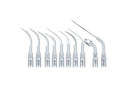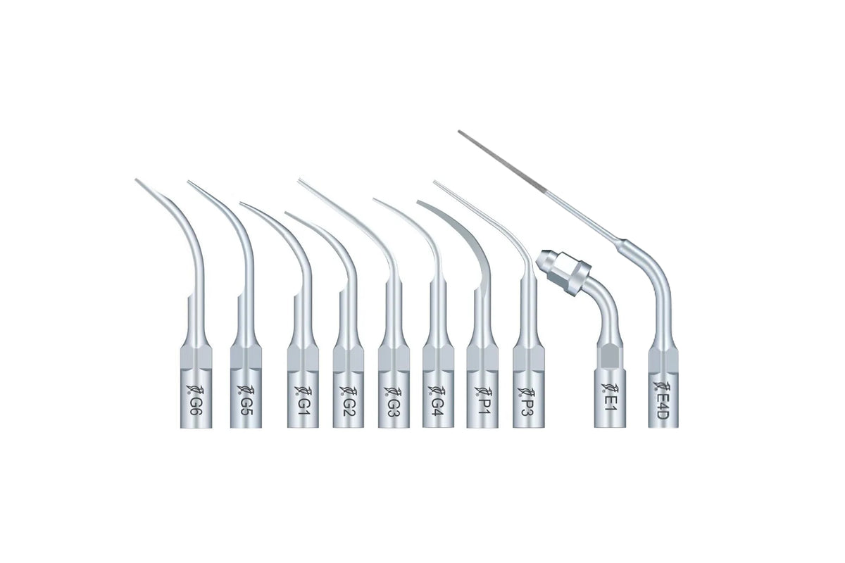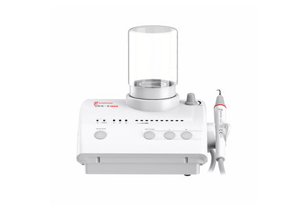 Different liquids, hydrogen peroxide, sodium hypochlorite, or chlorhexidine can be used here, for example PA treatment and root canal treatment with rinsing function, complete unit with container, and cable, handpiece with LED and 7 pcs tips and tips for endo.