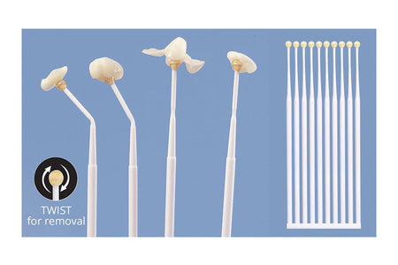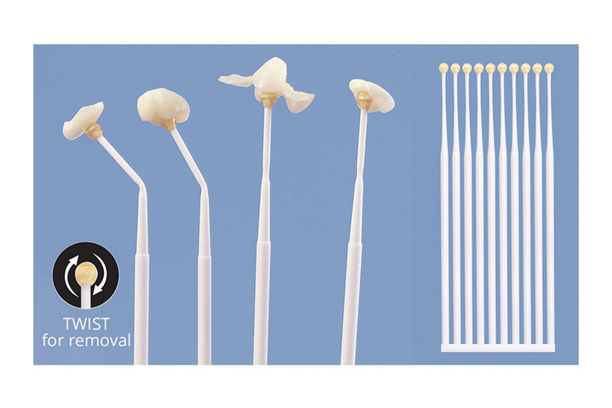 Praktischer Applikatorstab mit biegbarem Schaft und starkem Klebestift am Ende, geeignet zum Einsetzen und Repositionieren von Veneers, Inlays und Kronen. 11 cm