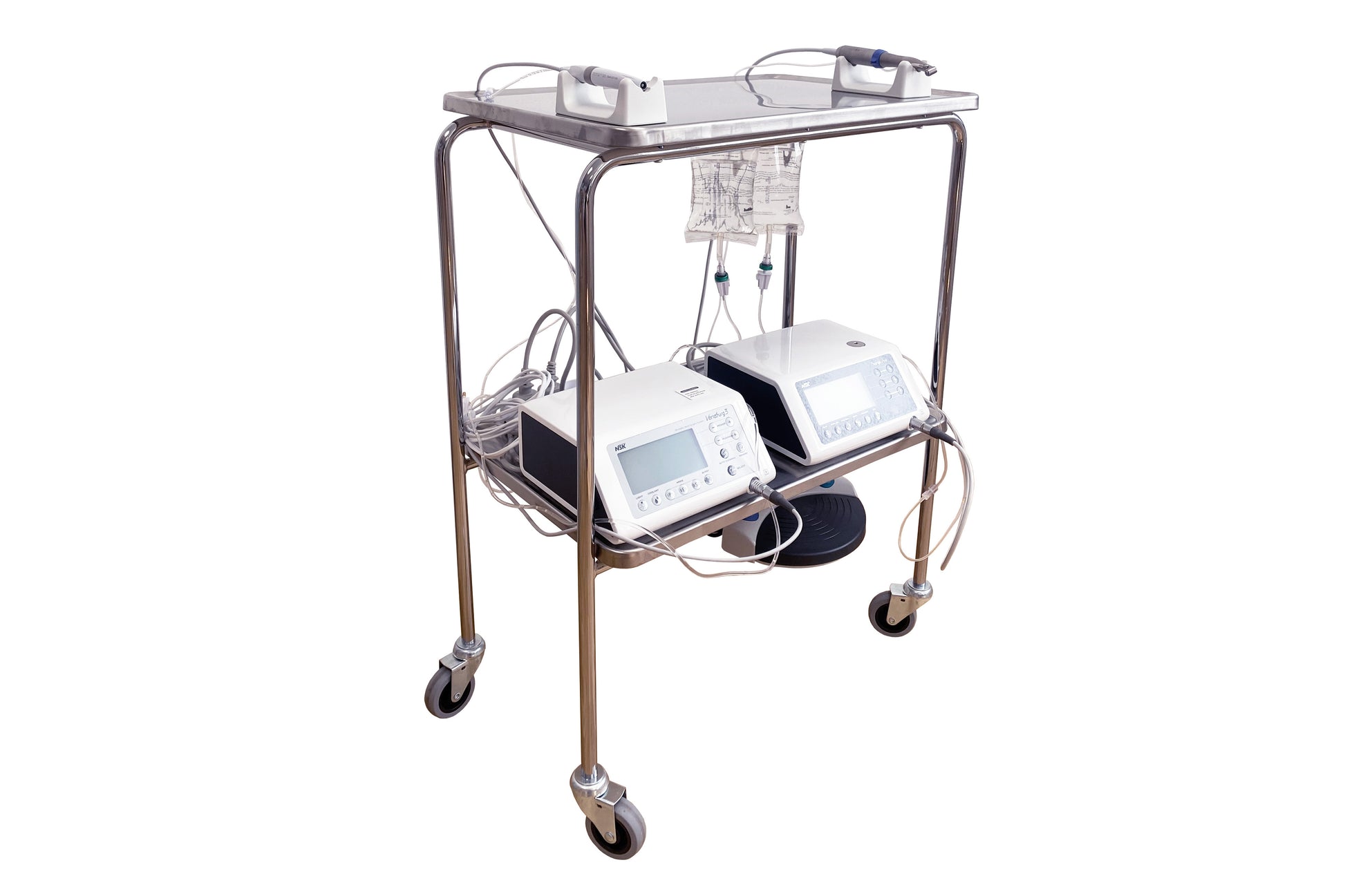 Mit 2 Ablagen und einer Gesamthöhe von 85 cm, so angepasst, dass unter der oberen Ablage 2 Wasserbeutel und unter der unteren Ablage der Fußschalter eingehängt werden können. 220V Netzkabel und Stecker für 2 Maschinen. Maße 60 cm lang und 40 cm breit.