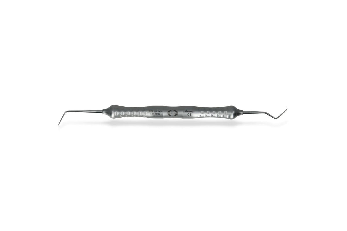 Abgewinkelte Sonde/Hakensonde aus Edelstahl mit 8 mm ERGO-balanciertem Schaft.