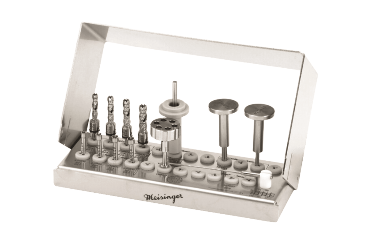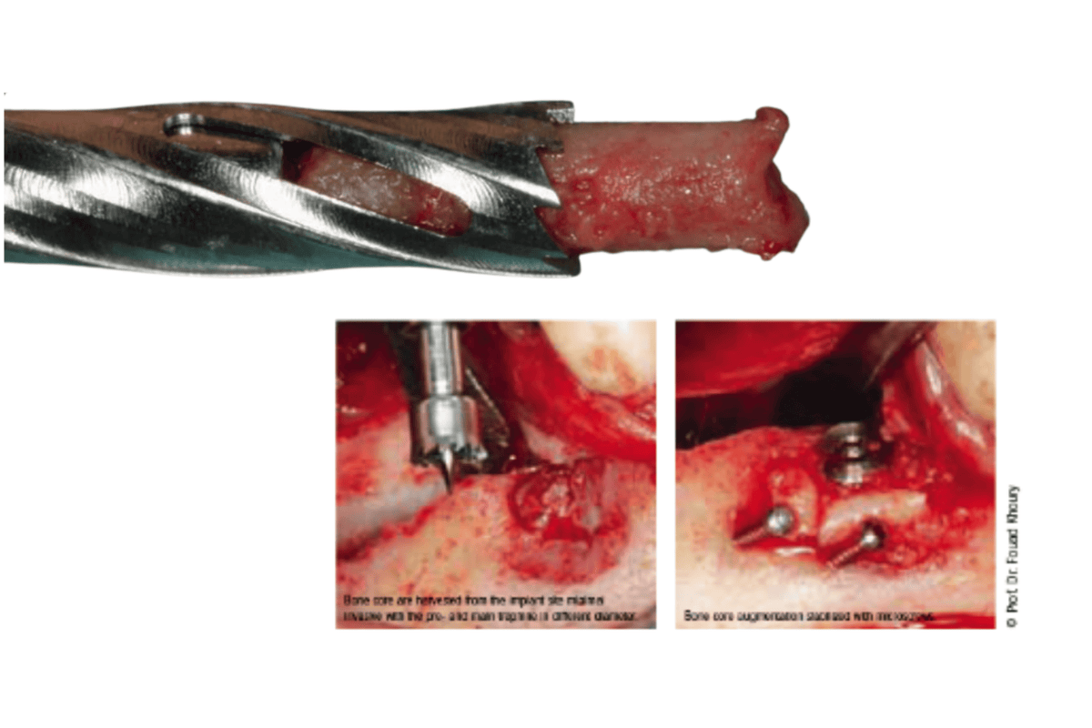 Ganzheitliches System zur Entnahme, Fixierung und Stabilisierung von kortikalen „Carotte“-Transplantaten. Knochenunterstützung und -aufbau ohne künstlichen Knochen und Membran, nur mit autologem Knochen. Das System besteht aus einem Trephine Ejection Kit zur Entnahme von Zylinderknochentransplantaten.