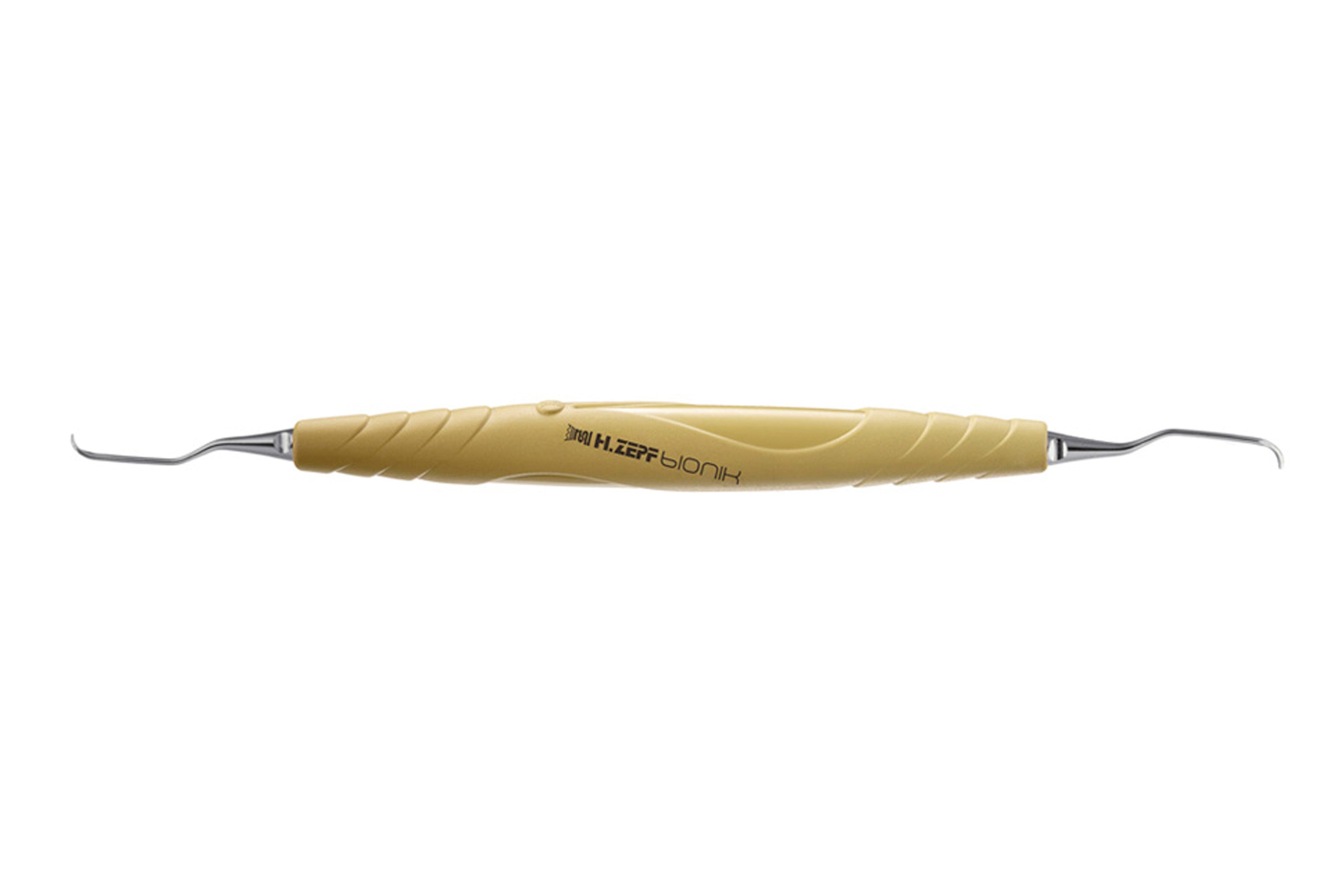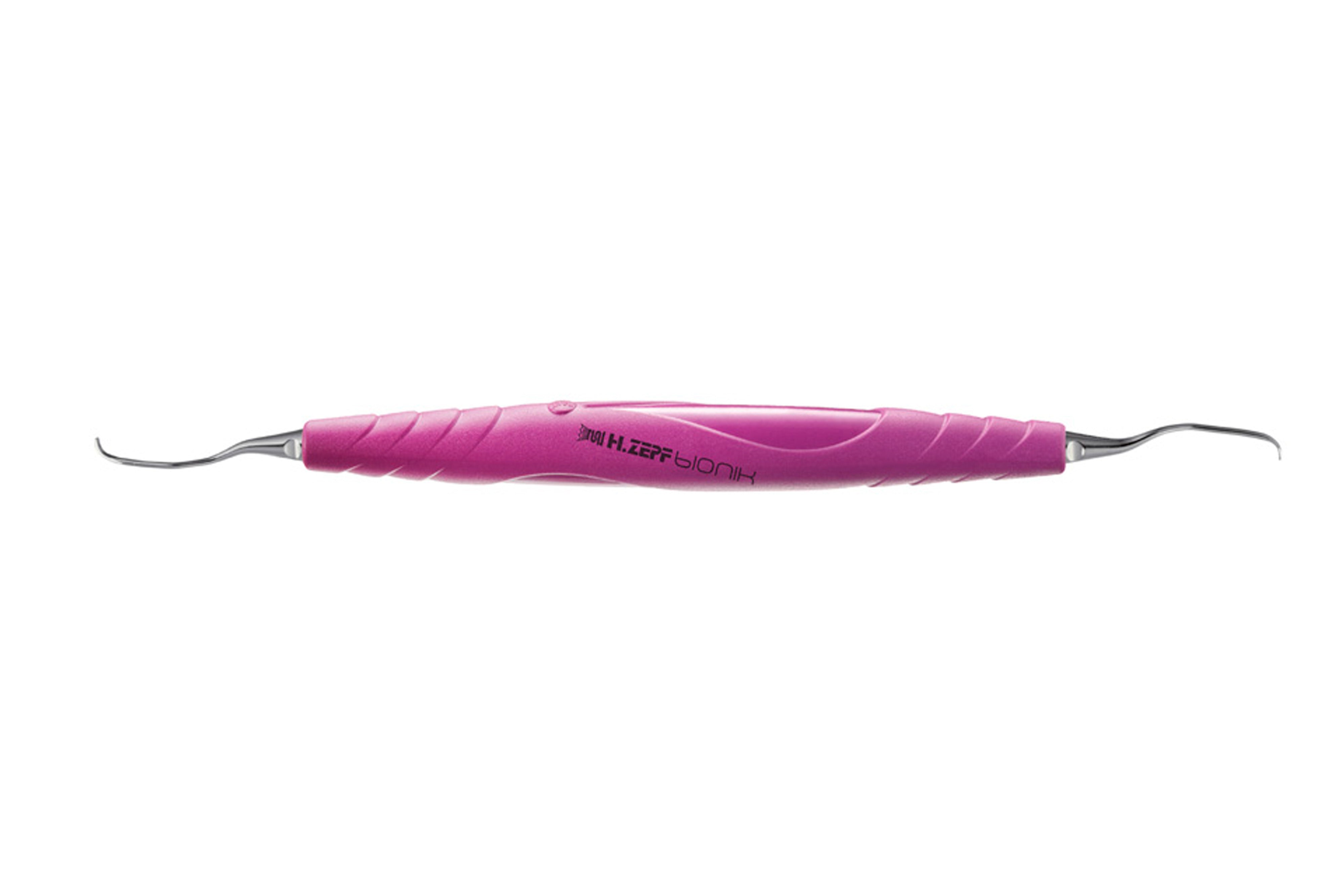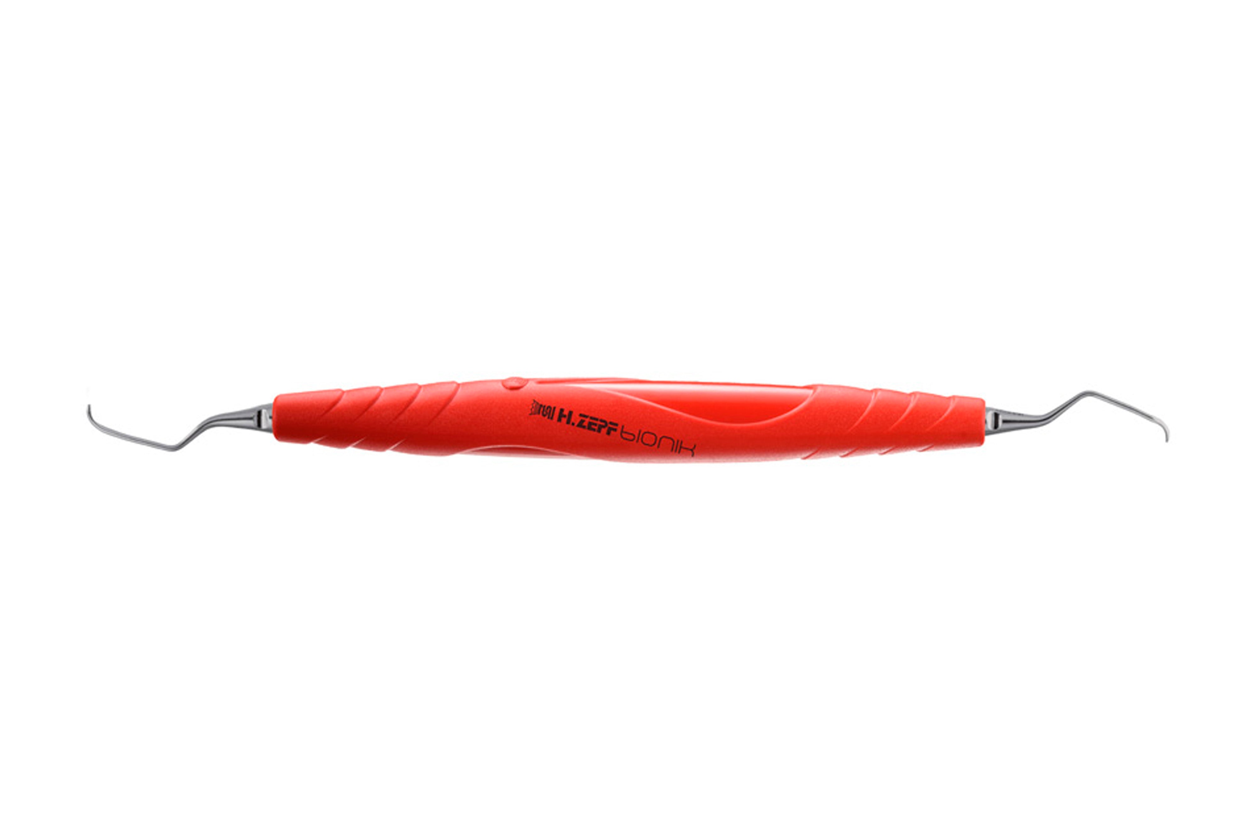 Entwickelt zur Entfernung von Plaquebildung auf Implantatoberflächen und zur Reinigung von Implantatoberflächen. Der Arbeitsteil ist 3 mm länger als bei herkömmlichen Küretten. Die Titanspitzen können bei Bedarf ausgetauscht werden. Ergonomisches Helmut Zepf-Leichtdesign, hervorragendes Fingerspitzengefühl.