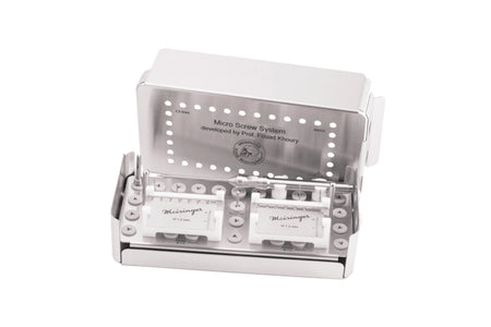 Das Besondere an diesem System sind die Schrauben mit einem Durchmesser von 1,0 bzw. 1,2 mm. Die Fertigung erfolgt aus chirurgischem Edelstahl, was trotz des reduzierten Durchmessers eine hohe Stabilität gewährleistet. Lieferung in einer praktischen autoklavierbaren Systembox aus chirurgischem Edelstahl.