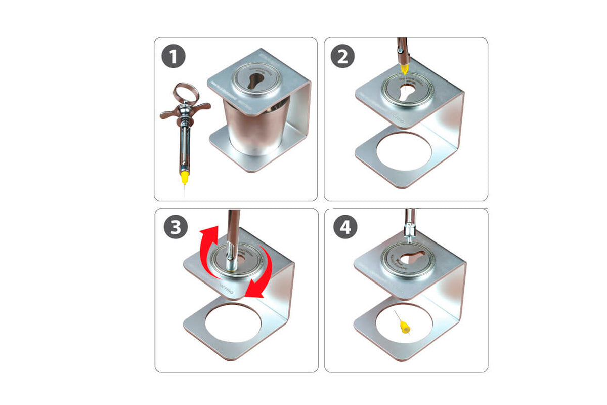 Eine einfache und sichere Methode zum Entfernen der gebrauchten Injektionsnadel. Setzen Sie die Nadel in das Schlüsselloch ein und drehen Sie sie gegen den Uhrzeigersinn. Hergestellt in Südkorea.