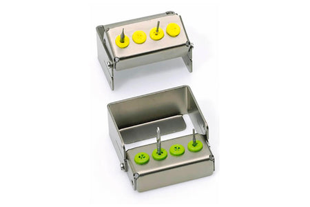 Der Nichrominox Plug'In 4-Loch-Bohrerhalter bietet eine kompakte und langlebige Lösung für die übersichtliche Instrumentenverwaltung in Klinik und Labor. Gefertigt aus Edelstahl mit Silikon-Steckbuchsen in einer Viererreihe bietet dieser Halter sicheren Halt für FG- oder CA-Bohrer jeden Durchmessers. Er verfügt außerdem über einen drehbaren Deckel für die flache oder abgewinkelte Präsentation und ist vollständig kompatibel mit allen gängigen Sterilisationsmethoden.