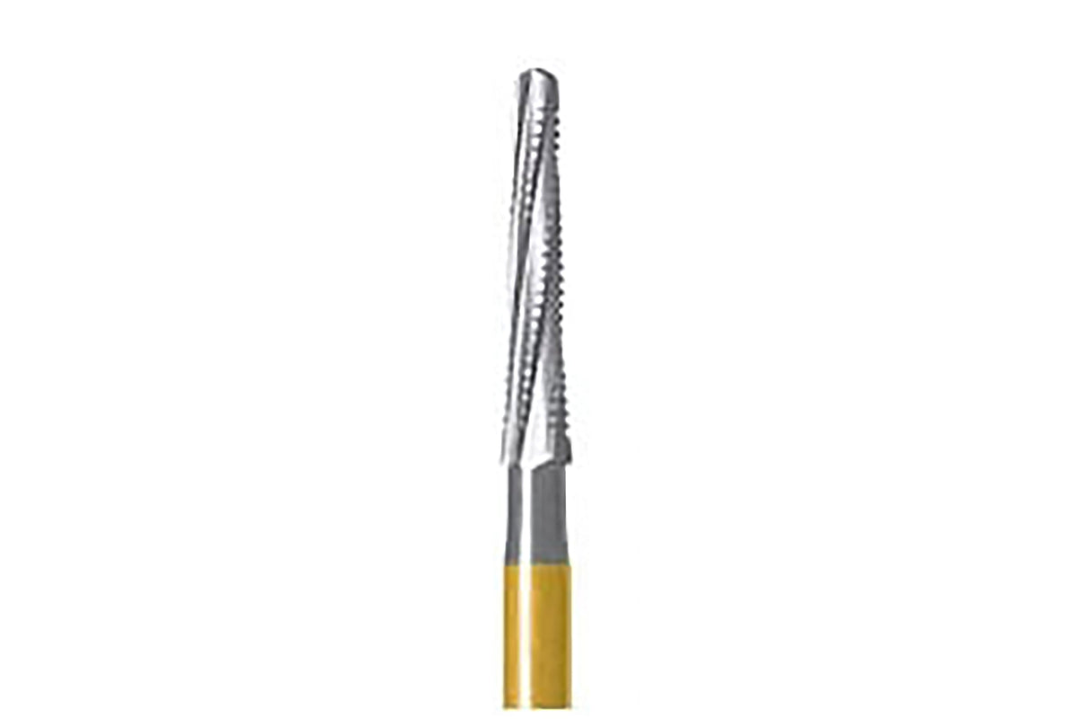 Spezieller endodontischer Bohrer mit langer, konischer Klingenkonfiguration und Kreuzhieb zur Vorbereitung eines trichterförmigen Zugangs in der Pulpakammer.
