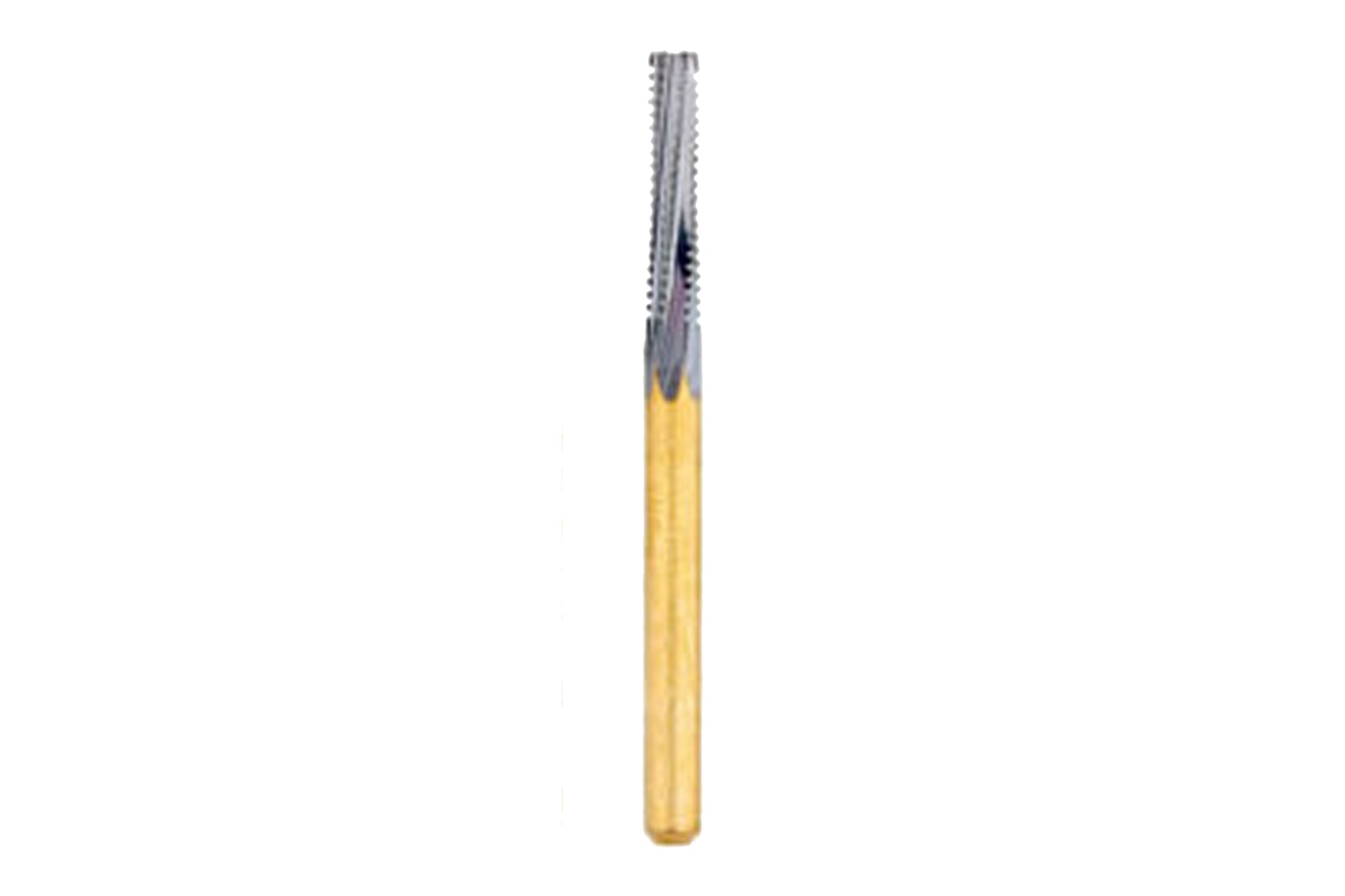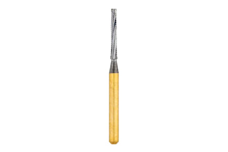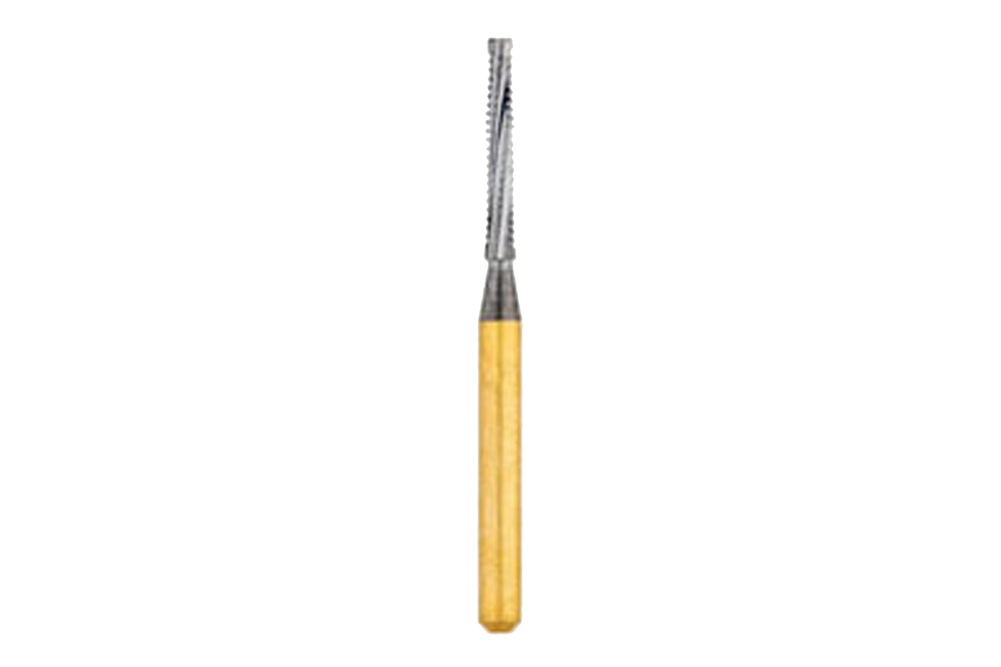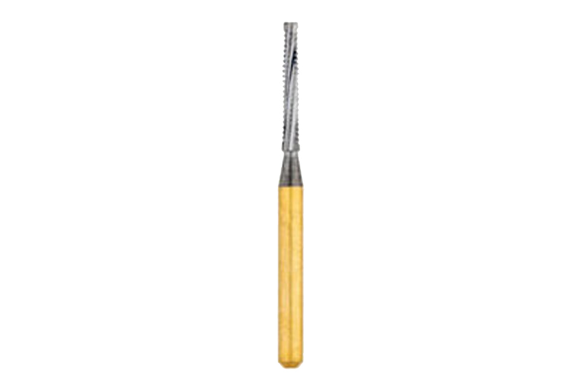 Der Bohrer ist einteilig, d. h. er besteht aus einer Vollhartmetallkonstruktion, die wie Butter schneidet. Wird im roten 1:5-Winkelstück mit ausreichender Wasserkühlung verwendet.