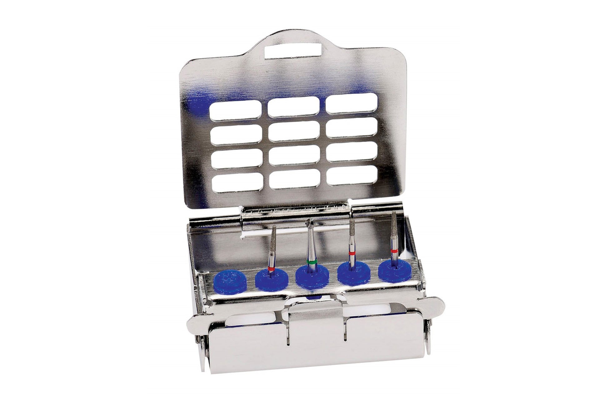 Bei geschlossenem Deckel fungiert der Halter als Minikassette, die den Bohrern hohen Schutz bietet. Der Innenhalter ist kippbar, sodass die Bohrer gut greifbar sind. Für FG und CA geeignet.