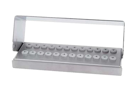 Bohrerhalter aus Edelstahl für 24 FG/CA-Bohrer mit grauen Silikonstopfen.
