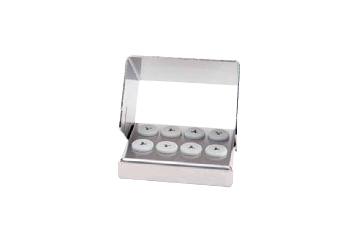 Bohrerhalter aus Edelstahl für 8 FG/CA-Bohrer mit grauen Silikonbuchsen.